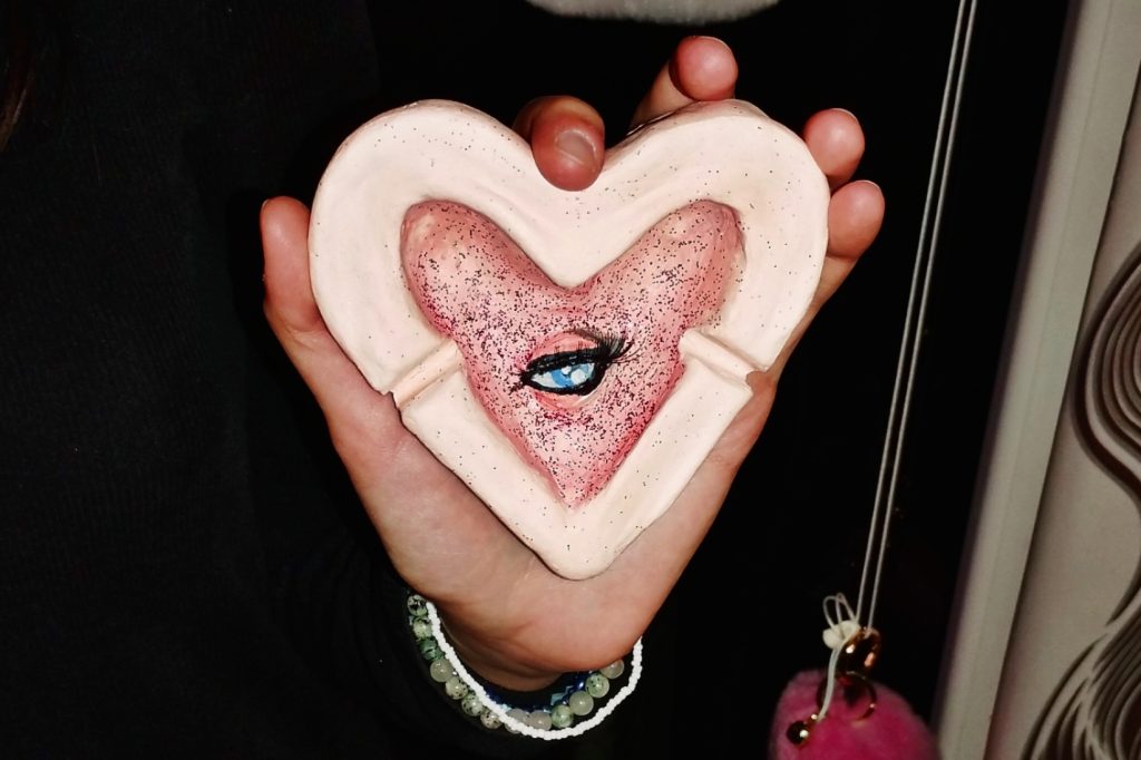 Art made with cold clay by me Heart-shaped Ashtray with an eye with lashes 👁️❤️ This ashtray is SOLD – but comissions are open 🌈 You can ask me for something like this or other cold clay ideas 🌞
