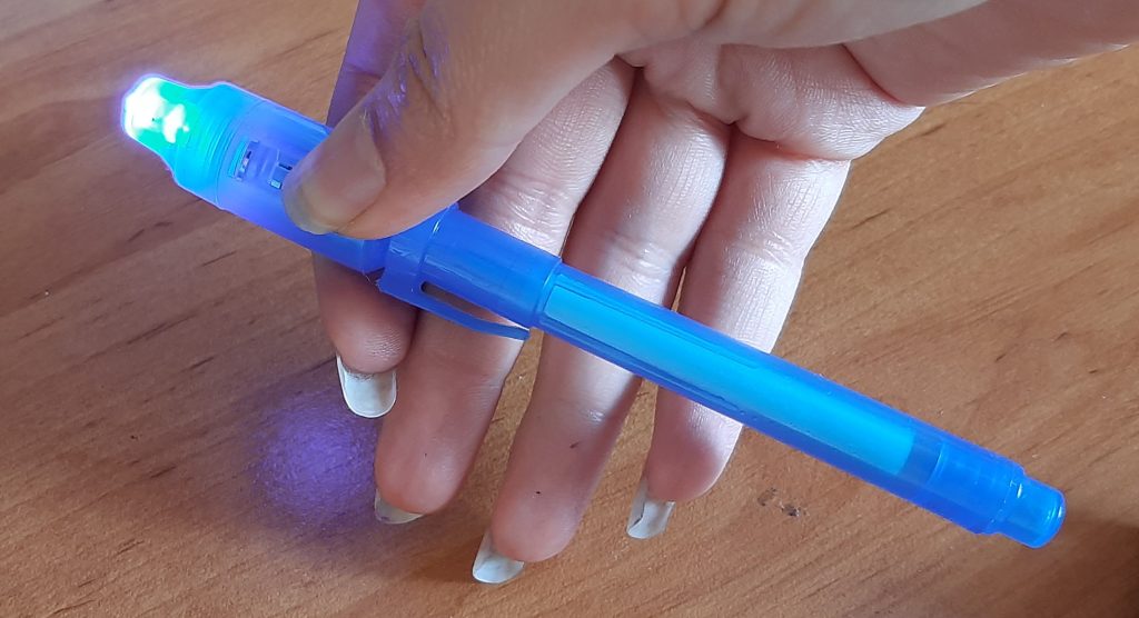 Bolígrafo mágico con tinta invisible y linterna con luz ultravioleta.